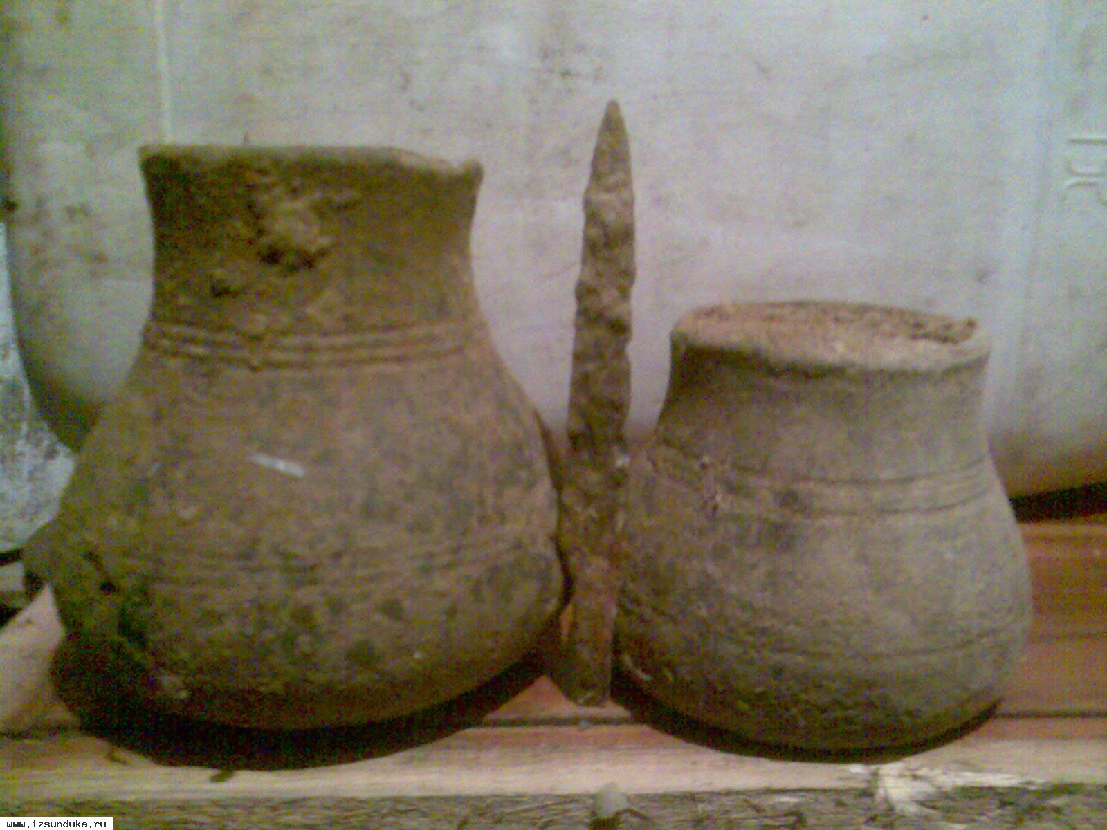 Два кувшина и подобие ножа. Найдены при оползне. Рядом лежали кости. Вообще на этом месте большой могильник.