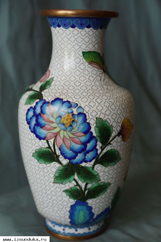 На светлом тулове вазы выделяется яркая многоцветная композиция в виде цветка и стрекозы. Подобный рисунок - один из традиционных сюжетов китайского декоративного искусства. Французский термин "клуазоне" означает "помещенный в ячейку" и относится к перегородкам, сделанным из медной проволоки, которые припаивали к металлическому фону, чтобы разделить участки эмали разного цвета. Ячейки заполняются эмалью и обжигаются, иногда по несколько раз, так как эмаль сжимается. Изделие обжигается при сравнительно низкой температуре, достаточной, чтобы растопить эмаль. После обжига сосуд полируется до образования гладкой поверхности, выровненной с краями перегородок. Выступающие края перегородок обычно покрываются позолотой. Первоначально отвергнутые китайскими знатоками за неэстетичные яркие металлические цвета, изделия в технике "клуазоне" стали использоваться в XV веке в качестве предметов обихода царского двора и ритуальных предметов в храмах. Первые образцы эмали "клуазоне" появились в Китае в XV веке и с тех пор технология