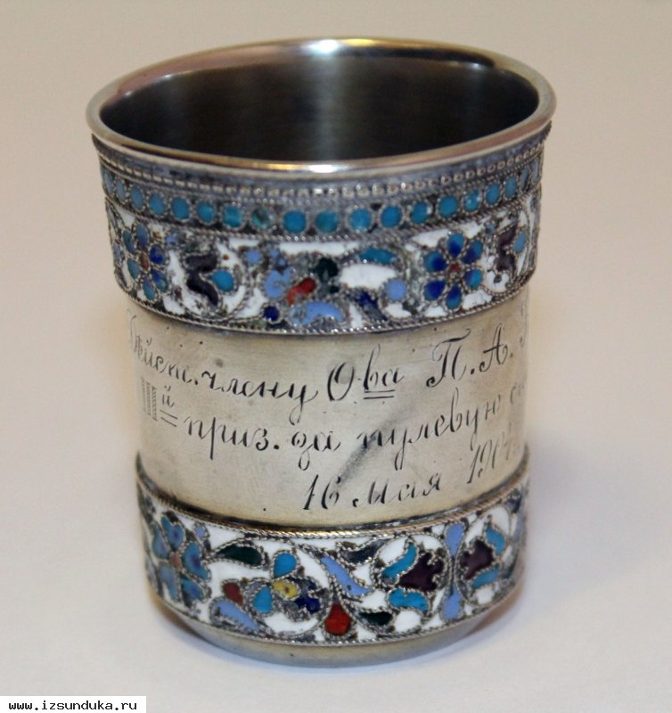 Старинная наградная серебряная стопка с перегородчатыми эмалями.