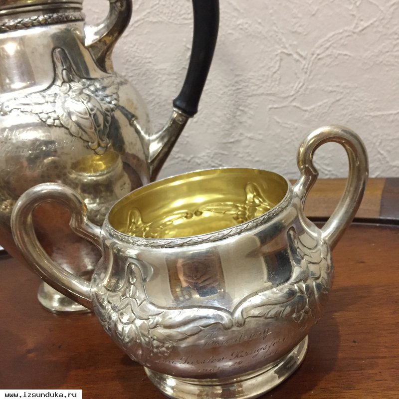 Добавлено 04.04.2018Роскошный старинный чайный набор из серебра "835" пробы с позолотой внутри в стиле Модерн (Art Nouveau) из трех предметов: чайник, молочник, сахарница. Датское Королевство, Копенгаген, начало 1900-х гг.