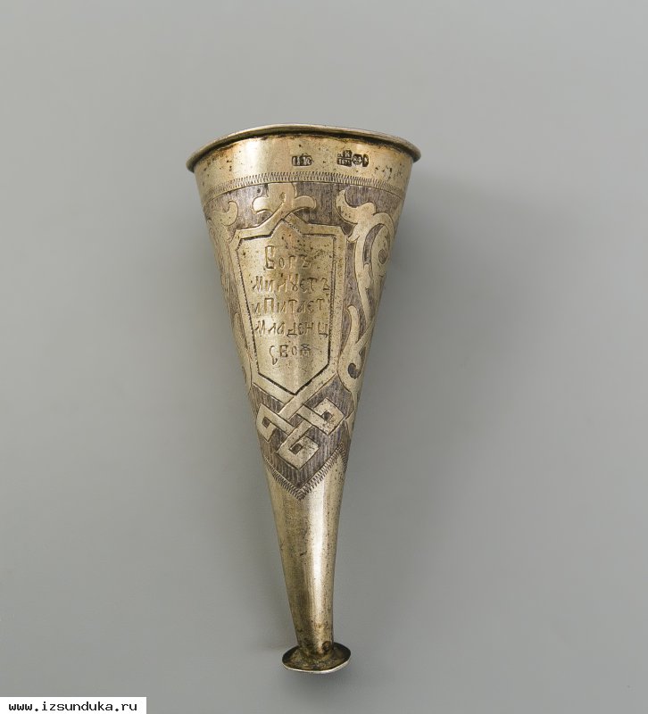 Клейма: «84 «пробы с гербом Архангельска «Архангелом Михаилом» и с инициалами пробирного мастера «И.К.» над датой «1875», мастера-монограммиста «Н.К.».
