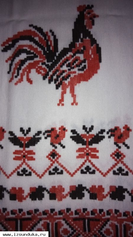 Рушник с орнаментом "Петухи". Хлопок и лён. Вещь с историей. Ретро. Размер - 40 х 230 см. Цвет белый, орнамент в красно-черных тонах. Не вышивка. Состояние нормальное.
