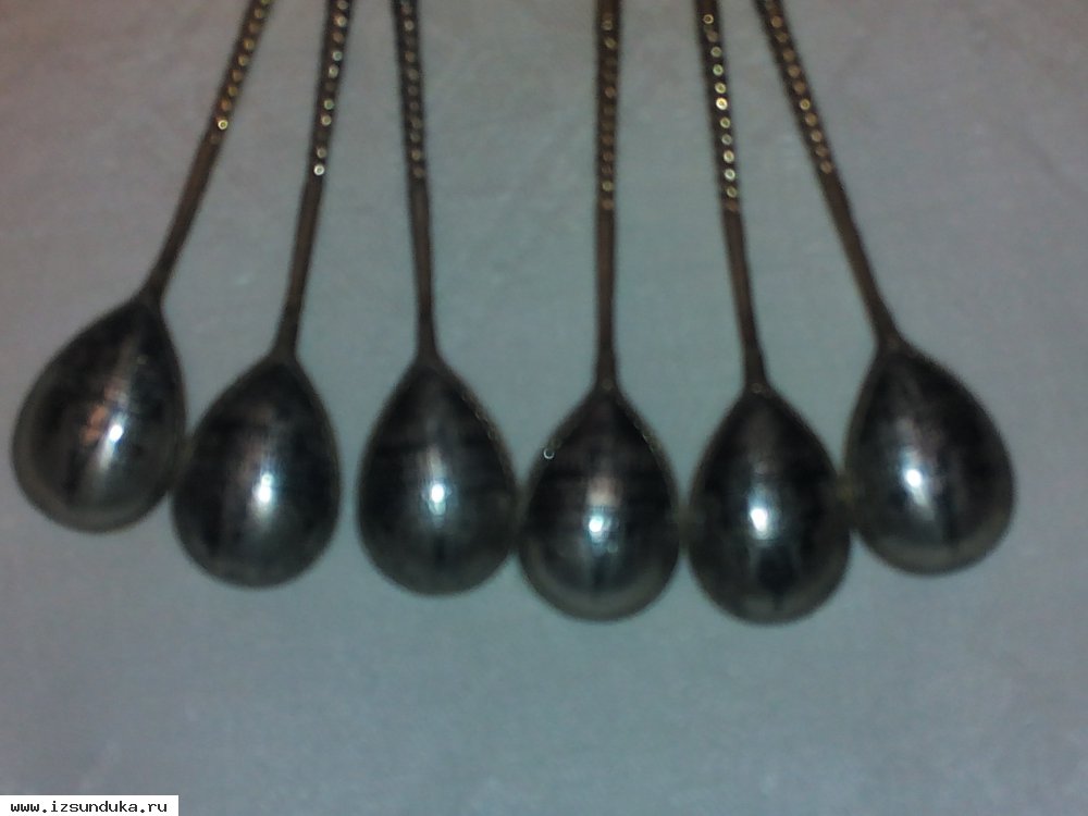 Продаются шесть кофейных ложек 84 пробы 1895 г., мастер Василий Антонов ("Красное") (клеймо "ВА"), 110 мм, вес -84 г, позолоченные, гравировка "Виды Москвы", в отличном состоянии