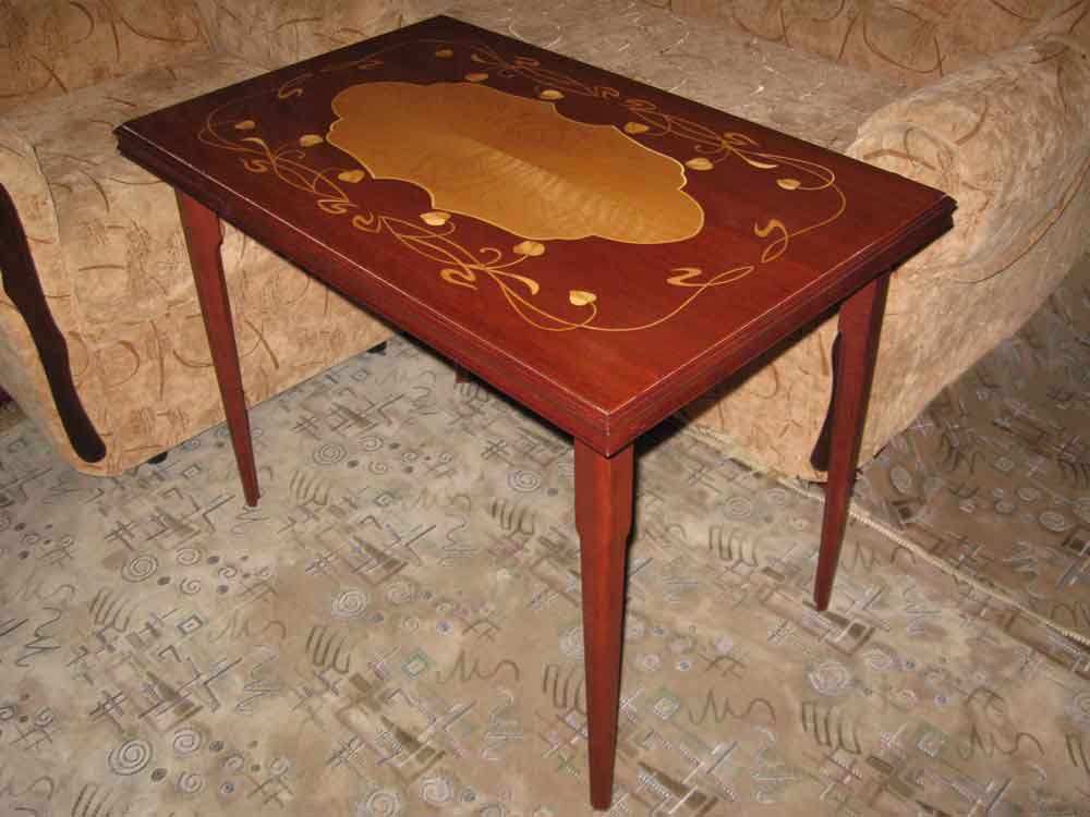 Эксклюзивная ручная работа, техника маркетри. Столешница: МДФ, облицованная натуральным шпоном: красное дерево, орех, клен. Ножки: массив бука Размер: 800 мм * 500 мм * 540 мм