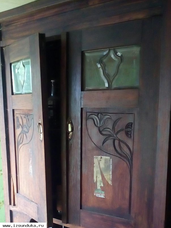 Шкаф с историей и орнаментом на дверцах. На мой непрофессиональный взгляд из натурального дерева. Передняя ножка подломлена.