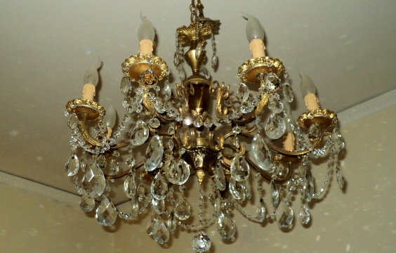 Добавлено 04.04.2018Люстра выполнена в 40-х годах прошлого века в стиле Рококо, с флористическим декором. Несущий шток состоит из трех вазонов : два верхних – латунные с патиной и нижний – бронзовый, от которого отходят фигурные рожки украшеные лиственным декором. Хрустальный убор – гирлянды в виде фестонов из кристаллов типа «олива» между рожками со светильниками, подвески типа «миндаль» размером 38-50-65-70мм, гранёный шар в окончании несущего штока. Восемь свечей адаптированы под лампы-миньон. Высота 45cм (без шара), диаметр 64см, длина цепи 50см.
