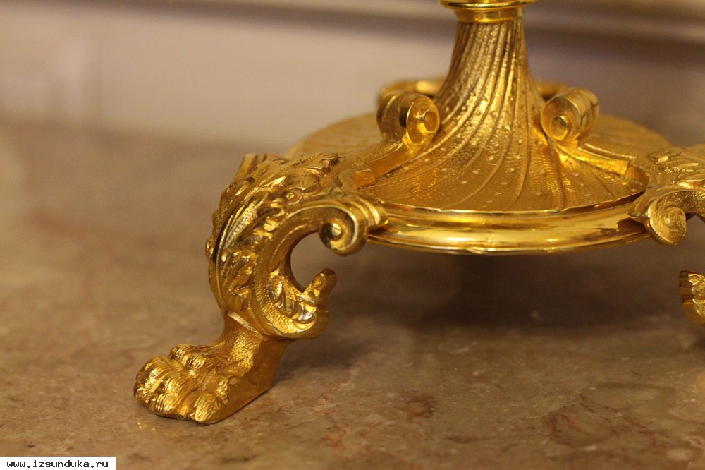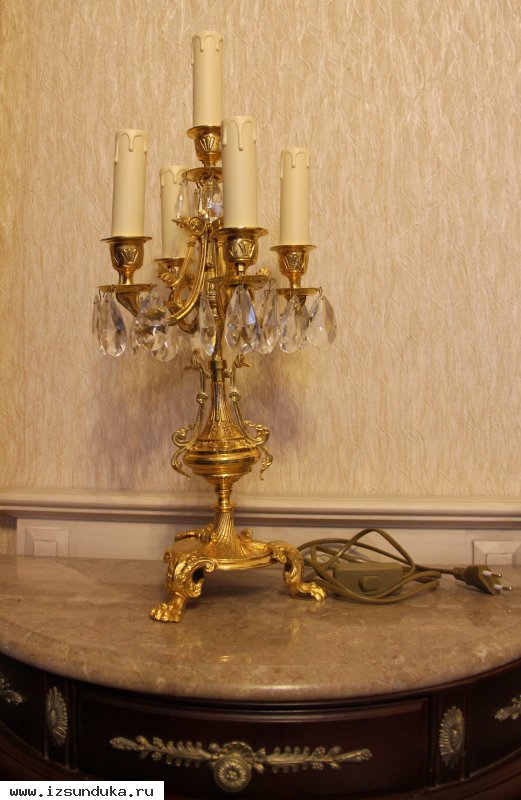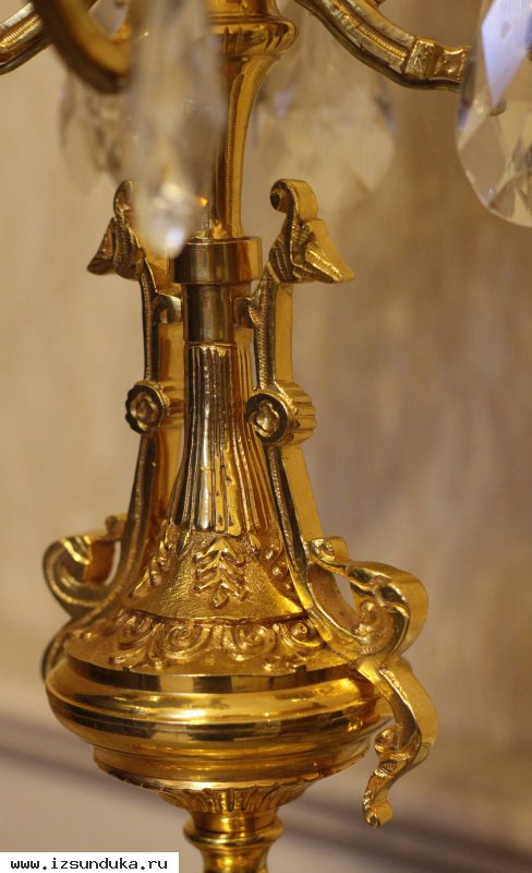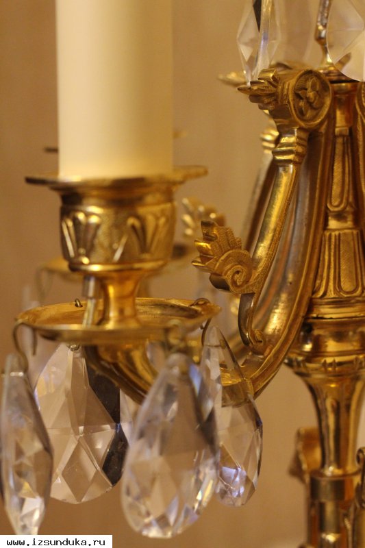 Стиль "Ампир". Бронза. Золочение. Состояние идеальное. Электропроводка, хрустальные подвески и имитация свечей современные (под патрон "миньон"). Высота 48 см. Изделие реставрировано квалифицированным реставратором с многолетним стажем.