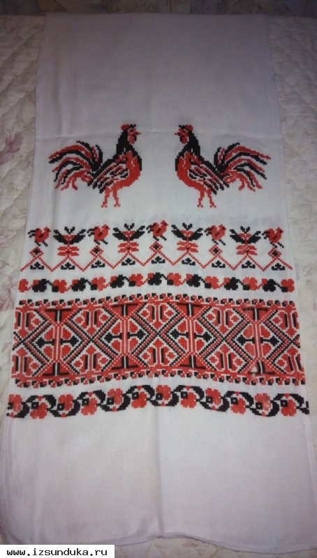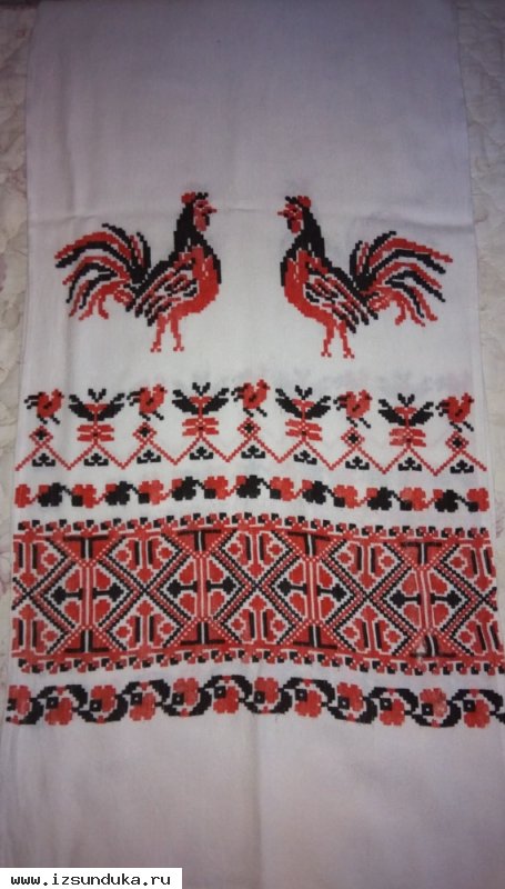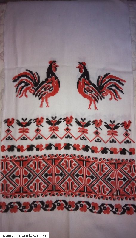 Рушник с орнаментом "Петухи". Хлопок и лён. Вещь с историей. Ретро. Размер - 40 х 230 см. Цвет белый, орнамент в красно-черных тонах. Не вышивка. Состояние нормальное.