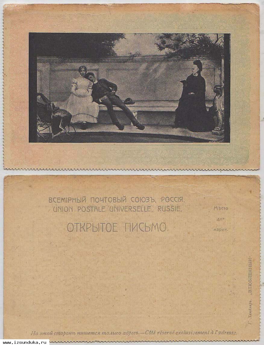 Открытка представляет собой репродукцию Г. Хендлера «Влюблённый». Напечатана Всемирным почтовым союзом до 1917 года. Чёрно-белое изображение заключено в цветную рамку тончайшего орнамента – что придаёт ей особенную изысканность.