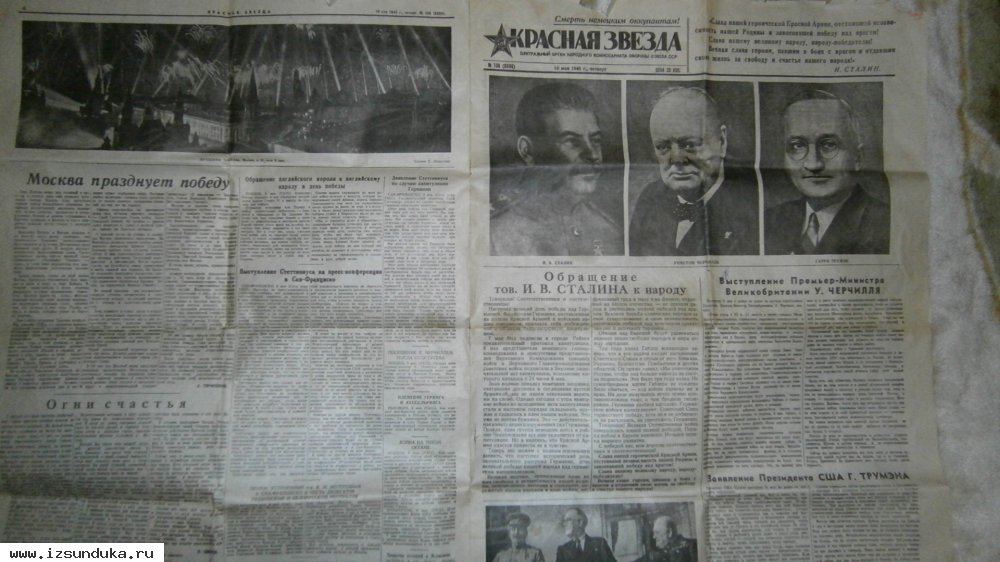 Продам оригинальный выпуск газеты 'КРАСНАЯ ЗВЕЗДА' от 10мая 1945г. в удовлетворительном состоянии (имеются небольшие незначительные потертости по линиям складок ). Самый первый выпуск после первого дня Великой победы.