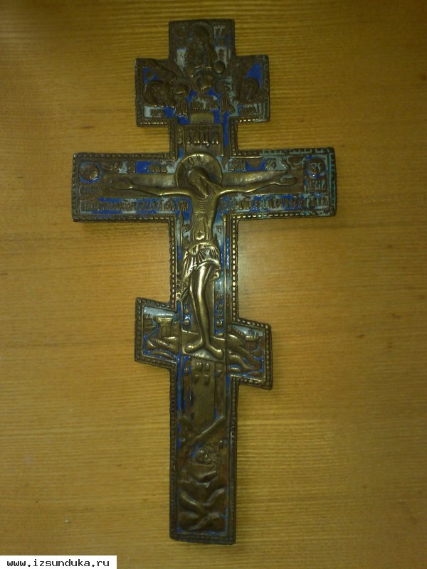 Добавлено 04.04.2018Старинное православное Распятие Христово, украшенное сине-бело-голубой эмалью, изготовлено в старообрядческих литейных мастерских , расположенных на Урале.Высота креста 27,2 см, ширина 13,6 см. Распятия подобного типа повсеместно распологались в домашних божницах (Красных углах) наряду с иконами и предназначались для молитв.