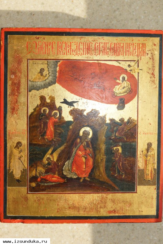 Икона "Огненное восхождение Ильи Пророка". Российская Империя, XVIII век. Материалы: дерево, левкас, темпера, позолота. Размер: 23 х 19 х 3 см. В отличном коллекционном состоянии. Без реставрации.
