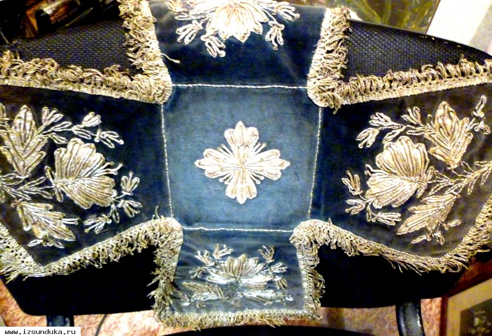 Старинный покровец, вышивка серебряной канителью по голубому бархату, размер 48 на 48 см. Конец 19 века