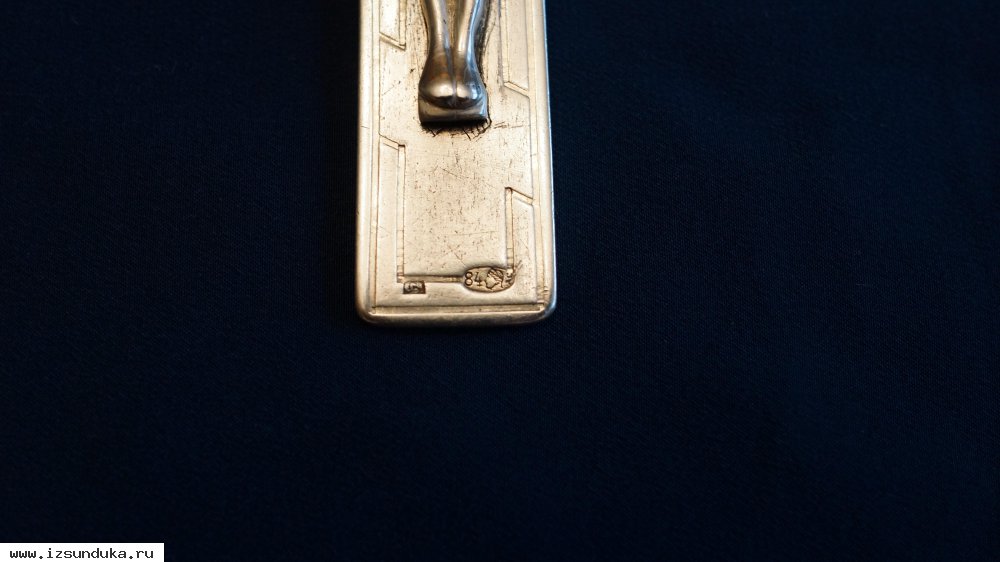 Клейма: женская головка в кокошнике, повернутая влево, альдерман пробирера "АС", именник мастера «ЕГЧ» (ювелир Чулков* Евдоким Григорьевич).