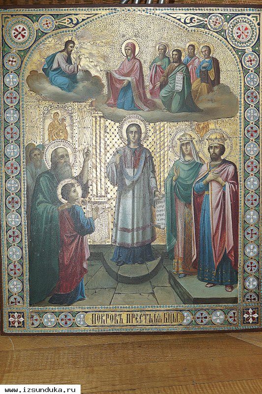 Добавлено 04.04.2018Икона храмовая Покров Пресвятой Богородицы с полихромными эмалями на золоте. Российская Империя, XIX век.