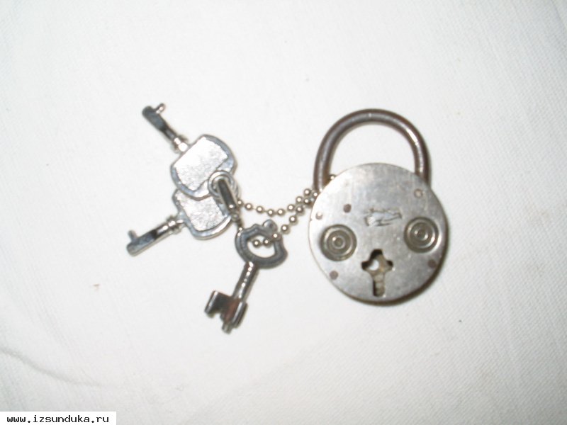 старинный замок из хромированной стали диаметром 3 см с заводским клеймом в виде птицы. Есть ключ. Дополнительно прилагаются еще два неизвестных ключа.