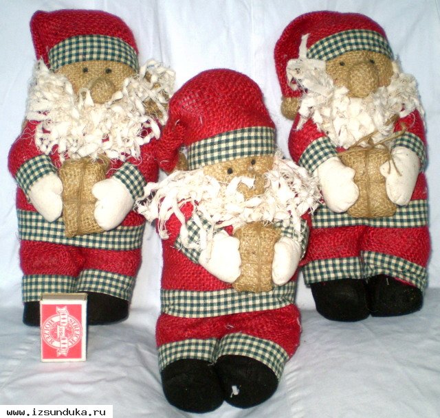 Деды морозы из мешковины. Рост - ориентир на спичечный коробок (5см).Отличное состояние. В подарок плюшевый рождественский олень 1980-е гг.