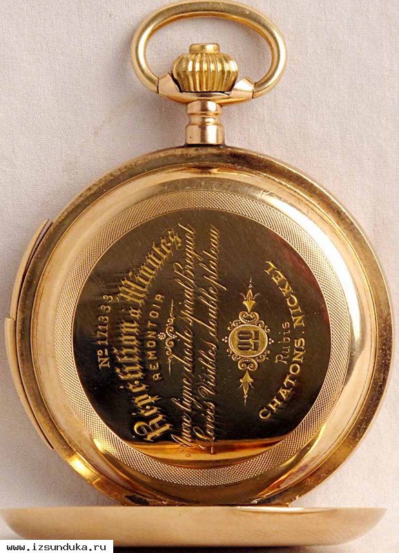 Добавлено 04.04.2018Корпус из золота 585 пробы, клейма корона, белочка, 0,585, 56, горн. Механизм и минутный репетир в рабочем состоянии На внутренней крышке надписи "№171333 repetition u minutes remontoir Ancre Ligne droite spiral Breguet Levees Visibblej double plateau Rubis chatons.nickel.Трещина в стекле. Фото с увеличением и дополнительная информация на www.vitalgor.vipcentr.ru