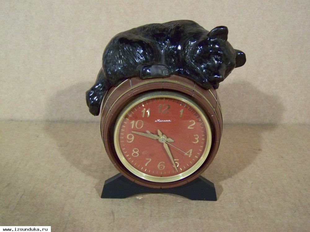 Механические часы МОЛНИЯ, бочка - пластмасса, мишка - силумин, меднение, исправны.