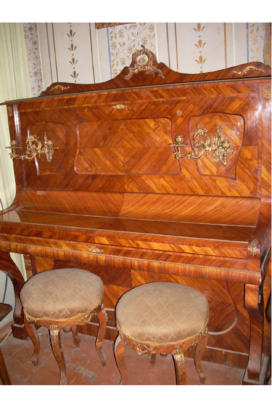 Антикварное пианино из розового дерева с фарфоровым пластом, с бронзовыми подсвечниками фирмы ‛Дидерих“ - поставщика российского императорского двора.