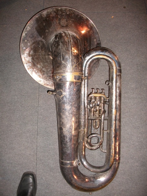 Туба фирмы BESSON&CO посеребренным покрытием,раструб фронтального исполнения,помповая.В Архангельск привезена 1942-44г.,по Ленг-лизу из Англии.Раструб и рабочая часть разборные.