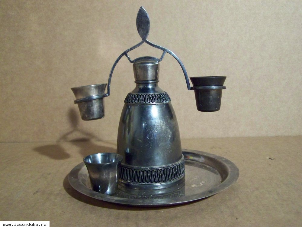 Высота штофа 15см, высота рюмок 3см, диаметр подноса 15см,мельхиор, скань, серебрение.