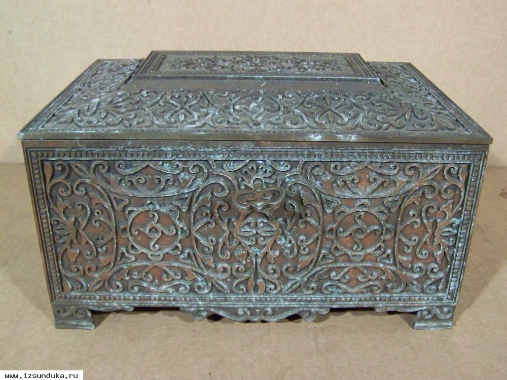 Металл, меднение, ширина 29, высота 17, глубина 20см, замок с ключом.