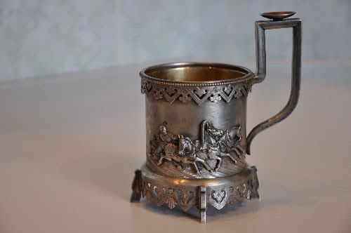 Добавлено 04.04.2018Подстаканник "Тройка в еловом лесу".Серебро,вес 248 г,высота с ручкой 13 см..Фигурное резное основание, литье,золочение,штамповка,выпиловка,монтировка,гравировка.Клеймо 84 пробы с женской головой,повернутой влево.Мастер "ВБ",фабрика серебрянных изделий Баладановой В.А. Имеется дарственная надпись,датированная 1913 годом