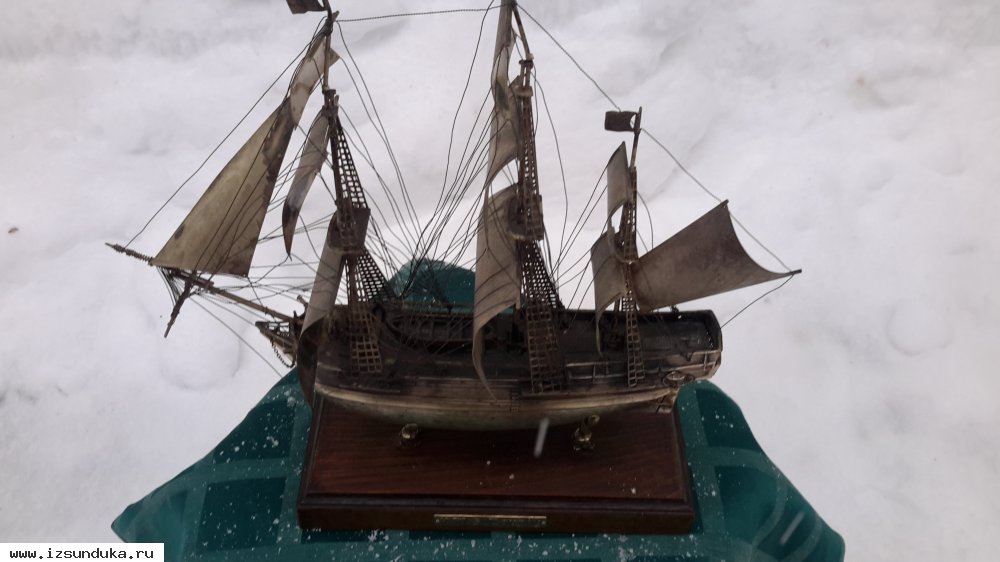 Продам антикварную серебреную копию легендарного английского трехмачтового парусника "Баунти". Вес: 1200 г. (серебро). Серебро: 800:825 пробы. Длинна: 35 см. Ширина: 29 см