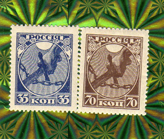 2 марки Рука с мечом, разрубающим цепь. Марки первого стандарного выпуска РСФСР. (без мелованой сетки !!!)Место выпуска РСФСР Москва Художник Рихард Зариньш Гравер Перикл Ксидиас Типографская печать 25 октября (7 ноября) 1918 г Номинал 35 и 70 коп.