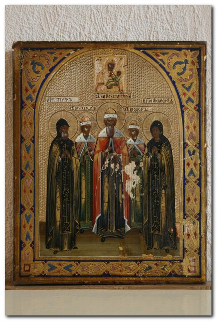 Святые благоверные князья Константин и чада его Михаил и Феодор Муромские, святые Петр и Феврония Муромские, кон.ХIХ-нач.ХХвв.,кипарис,темпера, сусальное золото, разм.14х17,5см.