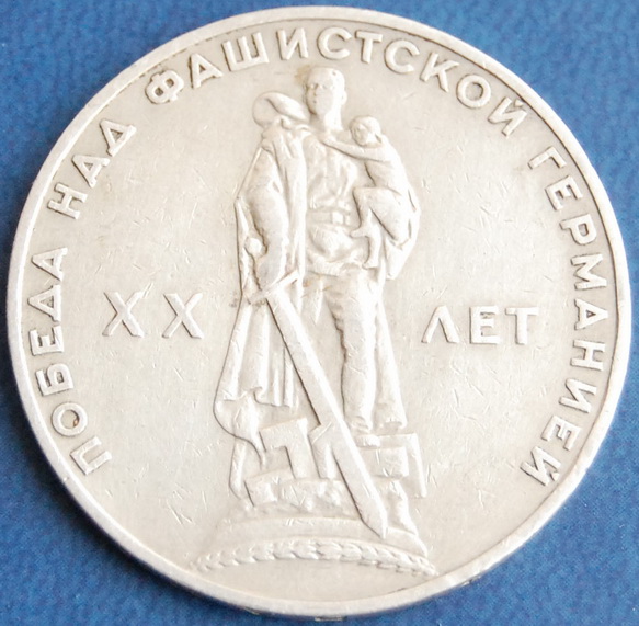 20 лет победы над фашистской германией. Из обращения, состояние хорошее, герб практически не затерт. Точки приближены к канту , гурт точка равномерно