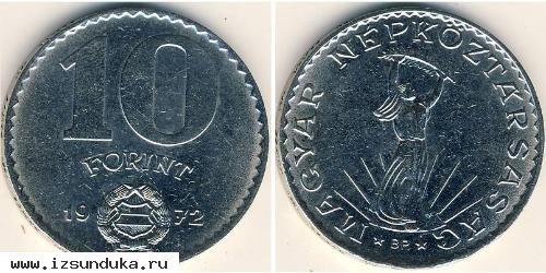 Венгрия 10 форинтов (1972 г.) Никель Номер по Краузе КМ#595, 8,83 грамма, 28 мм.