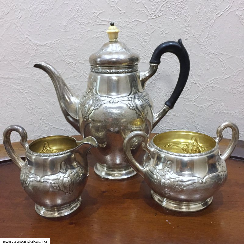 Добавлено 04.04.2018Роскошный старинный чайный набор из серебра "835" пробы с позолотой внутри в стиле Модерн (Art Nouveau) из трех предметов: чайник, молочник, сахарница. Датское Королевство, Копенгаген, начало 1900-х гг.