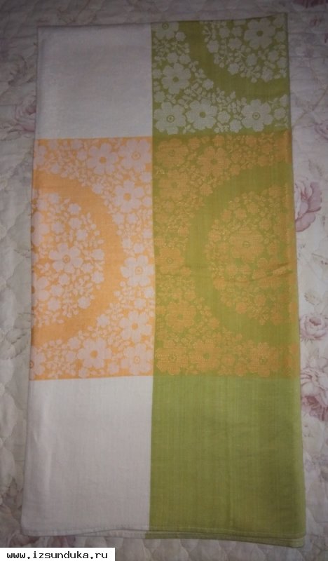 Льняная скатерть. Размер: 134 х 140 см. Основные цвета: белый, зеленоватый, желтоватый и оранжевый.