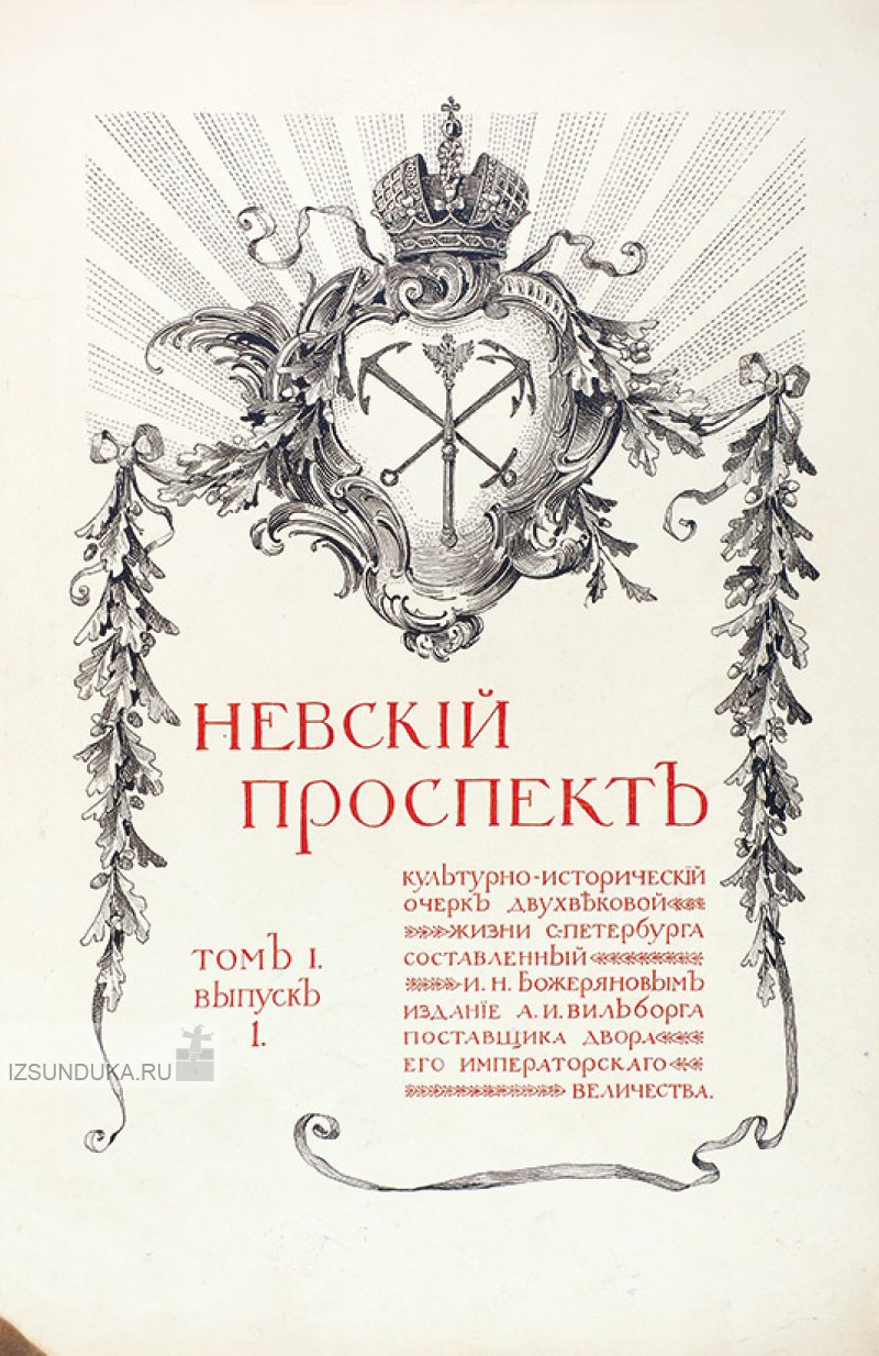 Божерянов, И. Невский проспект. Культурно-исторический очерк двухвековой жизни С.-Петербурга. 1703-1903. В 2-х тт. [в 5 вып.]. Т. 1-2. СПб.: Юбилейное издание поставщика Двора Его Императорского Величества А.И. Вильборга, 1901-1903 гг.