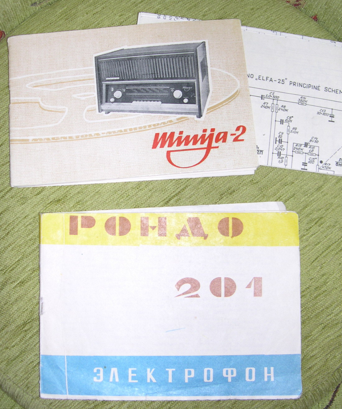 Инструкция по эксплуатации магнитолы MINIJA-2 модель 1964г. с принципиальными схемами приемника и магнитовона ELFA-25 (Вильнюс, 1965 г.) - 200 руб. Инструкция с принципиальной схемой проигрывателя грампластинок Рондо 201 (Казань, 1977 г.) -40 руб.