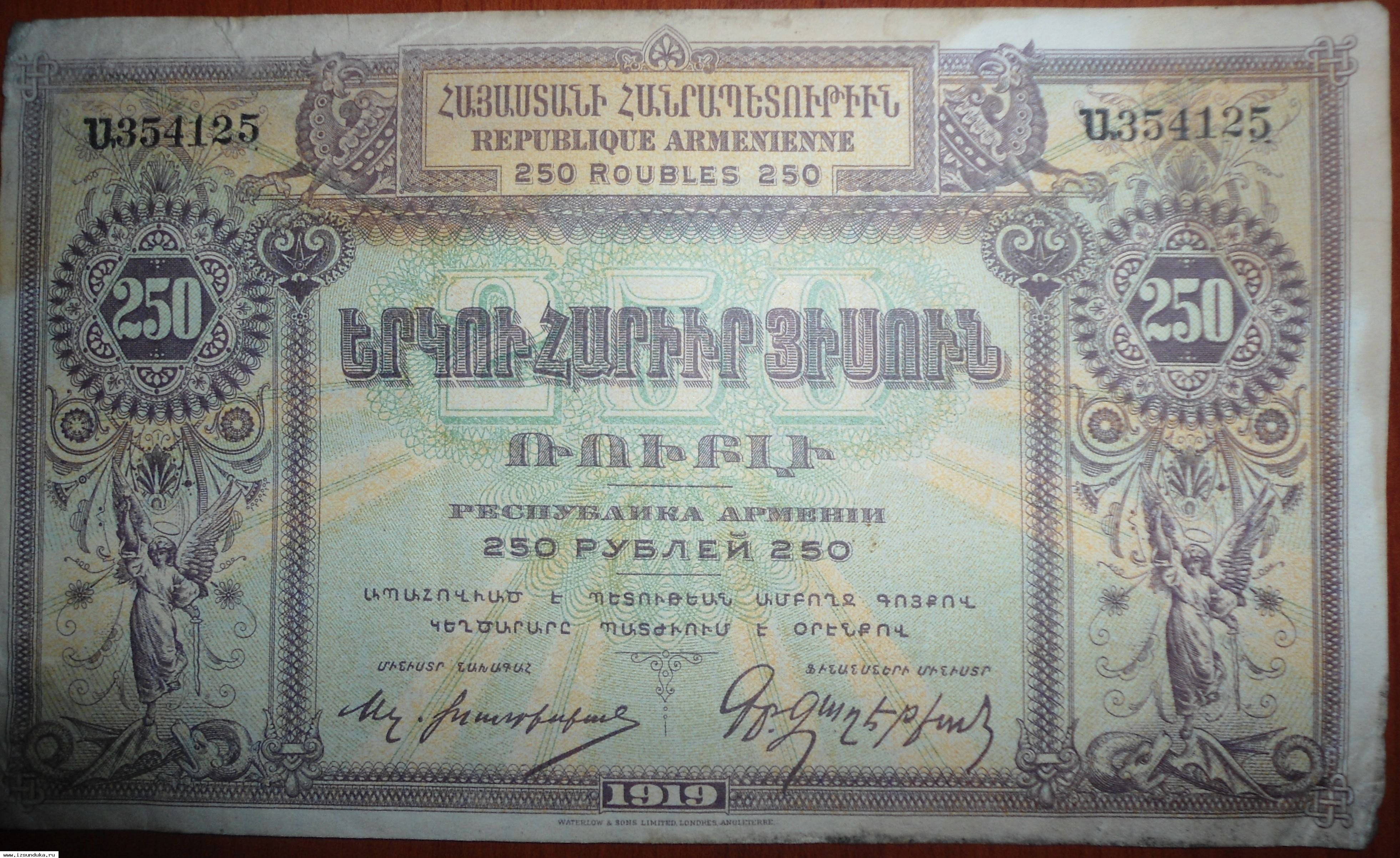 продаю 250 рублевый бумажная купюра 1919года(Деньги Первой Армянской Республики 1918-1920гг.)в хорошом состоянии. на купюре имеются надписи на трех языках,армянском, русском и английском.